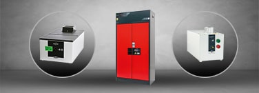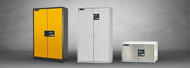 In total, there are four cabinet type classes: 15, 30, 60 and 90. The respective type class indicates how long the cabinet protects the hazardous materials stored inside against fire. The asecos cabinet models are available in various sizes, with different doors and door arrest systems as well as innumerable equipment options. Furthermore, there are different cabinets for the storage of combustible liquids, compressed gas cylinders, acids and alkalis and non-combustible chemicals and battery cabinets for the safe active and passive storage of lithium batteries.